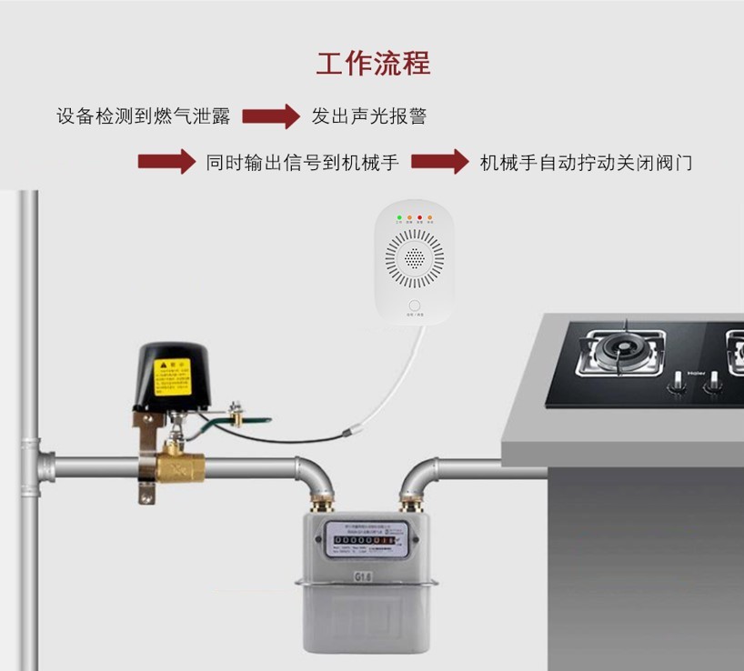 探测可燃气体(一氧化碳);实时设备状态监测,及时发现设备故障;多种报警方式(短信、微信、平台、电话等);1个接口可控制燃气紧急切断阀;1个接口可控制排风扇;简易壁挂式安装,简单方便。