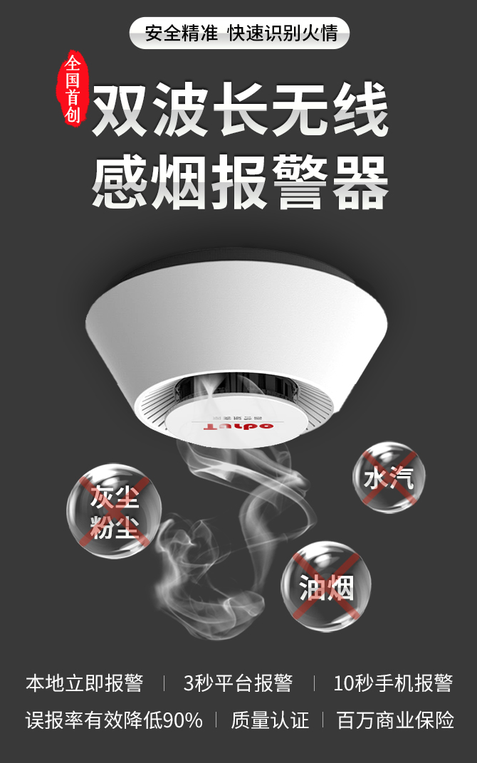 JTY-GD-TCN2010 双波长无线感烟报警器是采用一体式结构设计的无线感烟报警器,基于NB-IoT无线标准,具备远距离无线通信能力。为了降低误报率,在不影响火灾报警检测灵敏度的基础上,采用最先进的双波长检测手段,能够有效防止水雾、油雾以及大颗粒粉尘导致的误报现象。当发生火灾时,报警器能探测烟雾,支持声光报警,提示现场人员进行灭火处理或逃生。报警器可以检测电池低电量、光电 发射故障、无线通讯故障等,支持声光报警器提示。同时,可以将火灾报警信息、设备故障信息等通过无线方式实时地上报到远端消防平台,方便远程监控火情和维护设备。